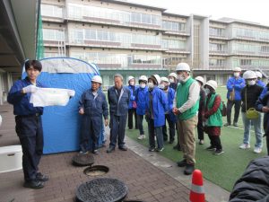 12月21日(日)第一小学校で弥生地域の七町会の防災会が避難所開設運営訓練に参加しました。備蓄物資の確認や避難者用テントの組み立て方、簡易トイレの設置等を学びました。